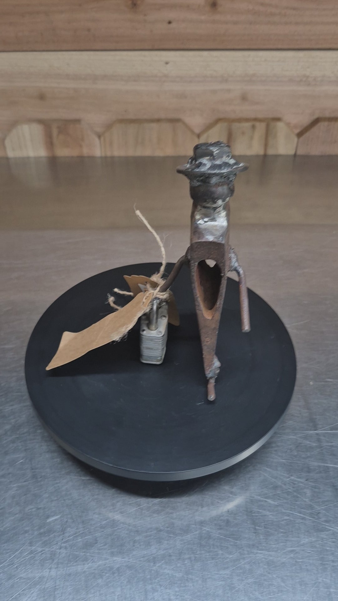 Add timeless elegance with a rugged twist to your décor with The Sophisticated Lady – Handmade Tool Art! 👒✨ Crafted and welded by Don & Debbie’s Designs, this unique sculpture showcases a refined figure in a stylish hat and coat made from an ax head, complete with a clever metal lock handbag detail. Created entirely from repurposed steel and hardware, it beautifully blends industrial edge with artistic sophistication.