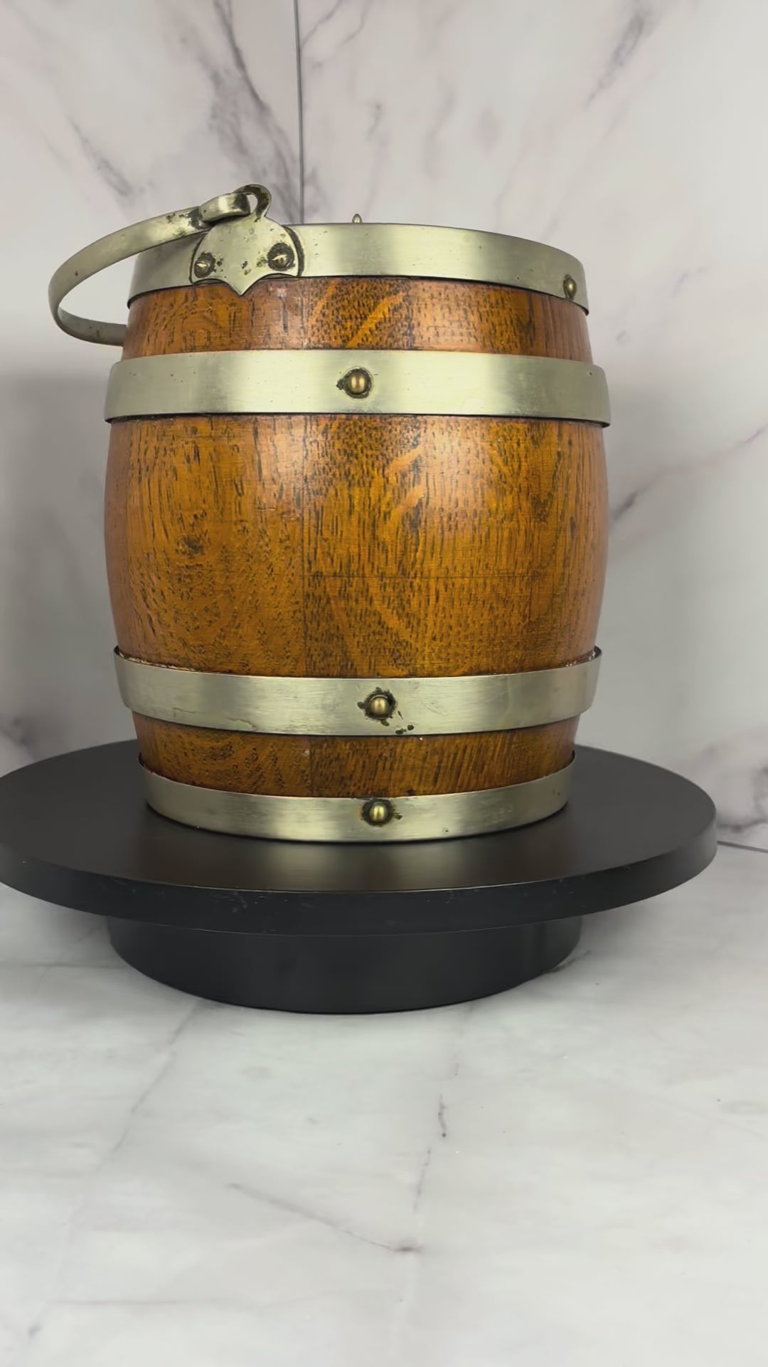 Step back into the elegance of the early 20th century with this antique oak ice bucket, complete with a white ceramic liner and metal handle. Trimmed in EPNS (electro-plated nickel silver), this piece reflects the craftsmanship of the 1920s–1930s, when barrel-style ice buckets became a fashionable staple in home entertaining.