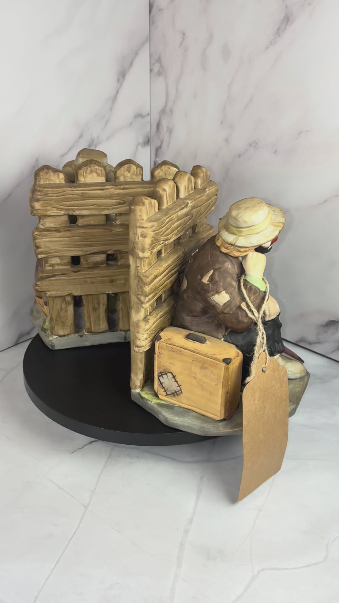 Bring a touch of classic Americana into your home library with this pair of vintage Emmett Kelly clown bookends. 🎩 Each hand-painted ceramic piece depicts the beloved hobo clown in his signature patched clothes and expressive face — one figure resting thoughtfully beside an umbrella, the other smiling as he holds a puppy. Both are set against a rustic wooden fence backdrop, making them a charming matched pair.
