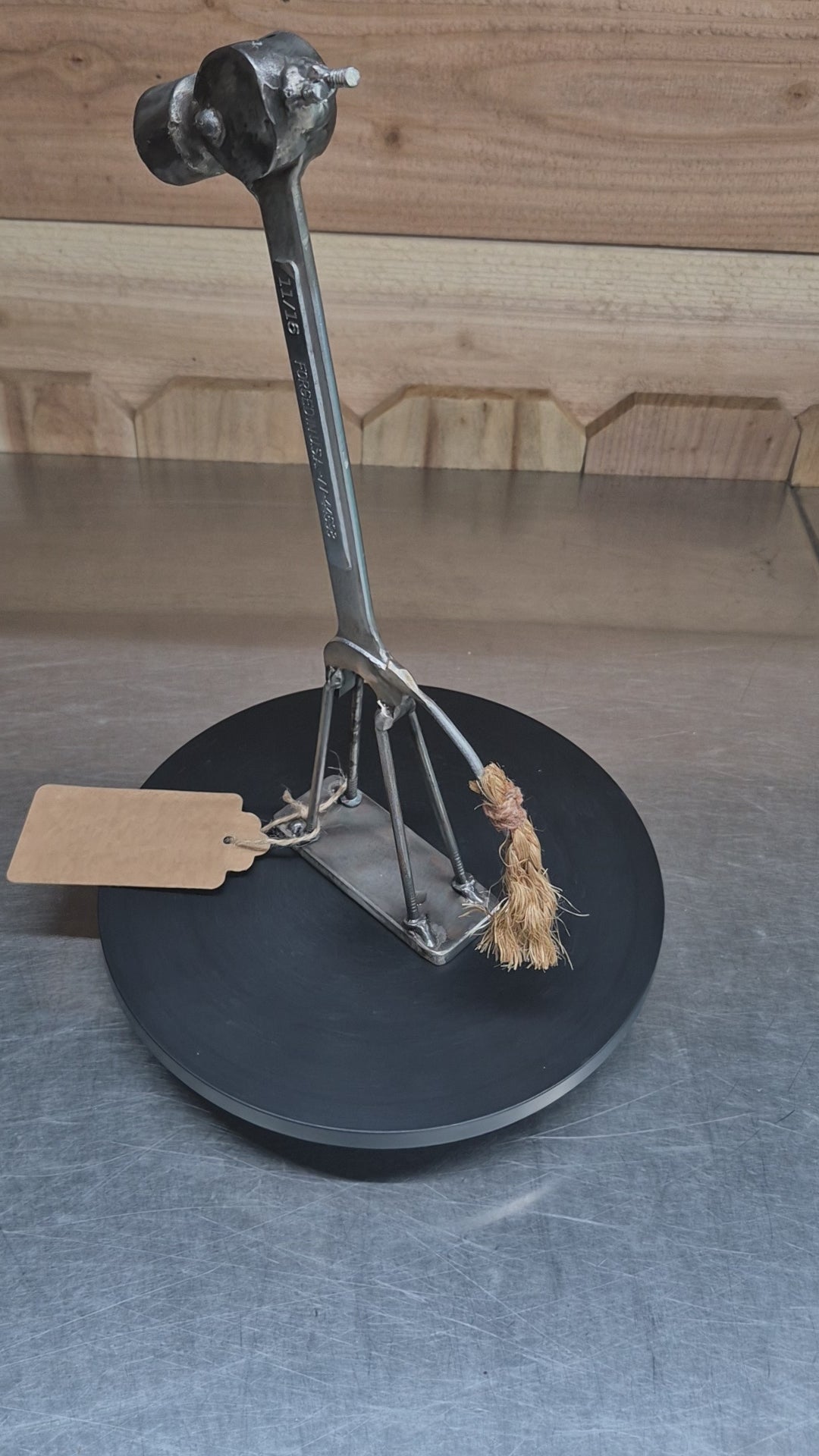 • Crafted using a wrench, hammer head, and nails for legs