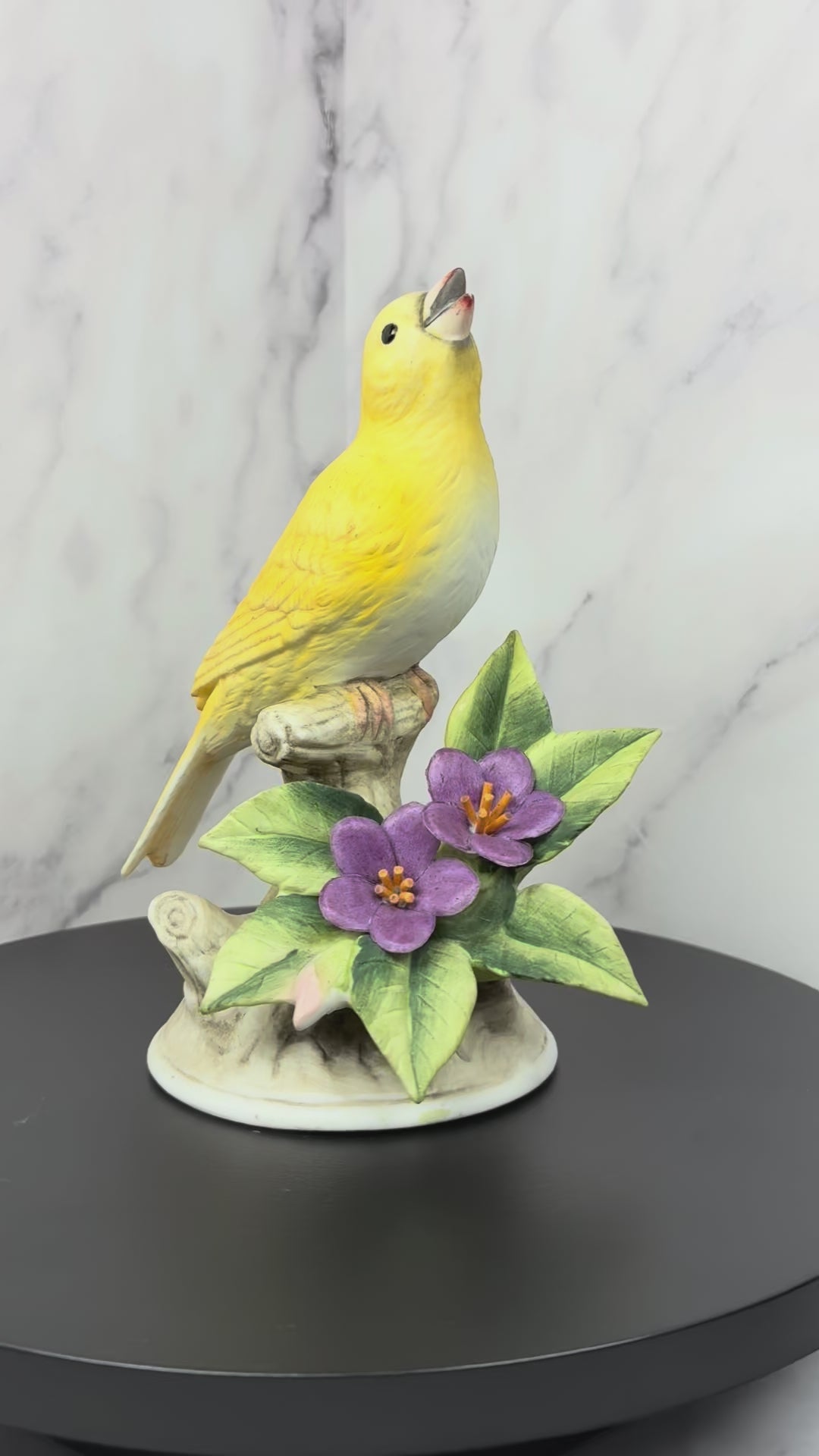 Brighten your space with this vintage Andrea by Sadek "Canary" figurine, featuring a vibrant yellow canary perched on a branch beside beautiful purple flowers. Expertly crafted with lifelike details, this piece captures the cheerful spirit of songbirds and is perfect for collectors and nature lovers alike!